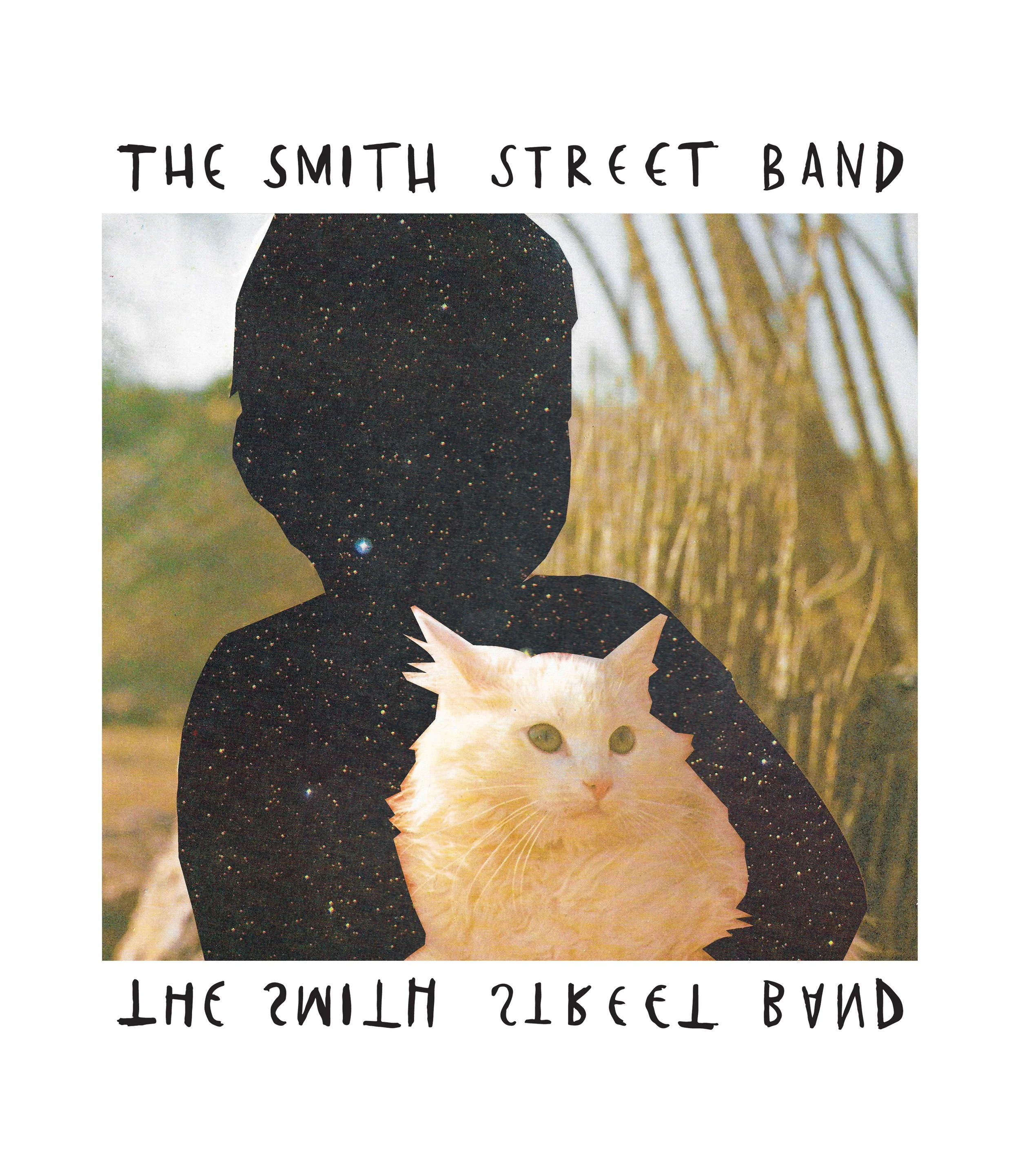 Album cover for 'The Smith Street Band' featuring a collage with a silhouette of a person filled with a starry pattern and a white fluffy cat in front.